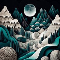 Een surrealistisch winterlandschap met abstracte bergen, bomen en valleien in turquoise, witte en grijze tinten. De grillige, ijzige toppen rijzen dramatisch omhoog, met gelaagde texturen die doen denken aan ingewikkeld, geometrisch houtsnijwerk. Kleine, taps toelopende bomen omzomen de besneeuwde hellingen en creëren een dicht,…