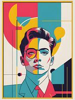 Een opvallend hedendaags pop-artportret van een stijlvolle jongeman weergegeven in gedurfde geometrische kleurblokken van roze, groenblauw, geel en marineblauw. Het artistieke gebruik van gedeelde kleurvlakken over het gezicht creëert een dynamisch, modernistisch effect dat traditionele portretten uitdaagt terwijl het een koele,…