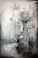 Een abstract schilderij in zwart, wit en grijstinten met geometrische vormen en vloeiende lijnen straalt een mysterieuze en dromerige sfeer uit.