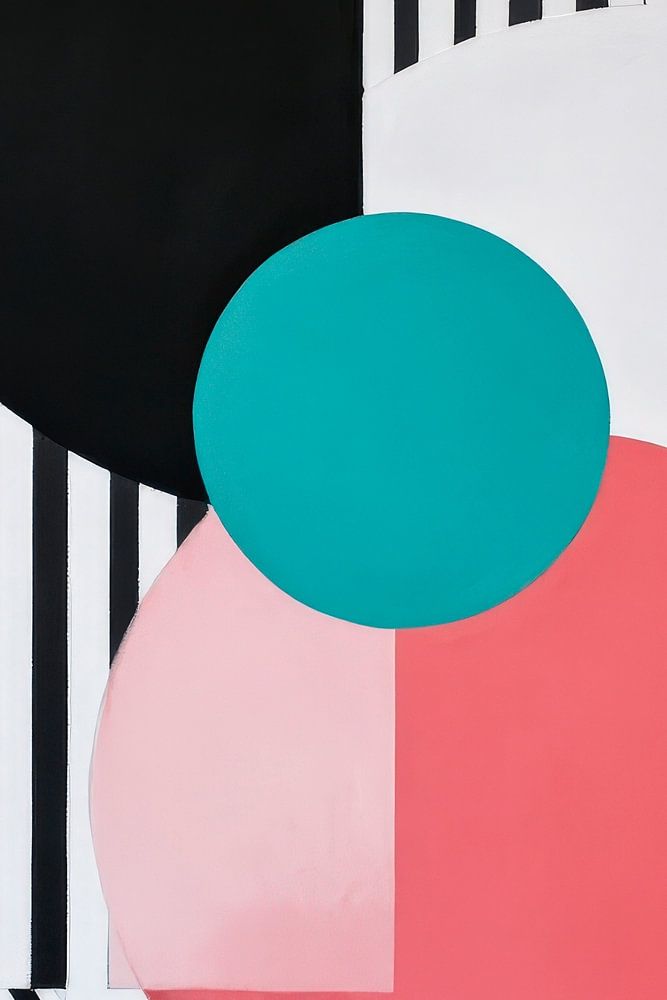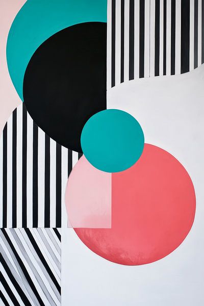 Hier ontvouwt zich een speels samenspel van geometrische vormen in levendige kleuren en sterke contrasten. De harmonieuze cirkels en opvallende strepen geven de kamer een dynamisch tintje. Dit kunstwerk is perfect voor de woonkamer om een modern accent te creëren en gesprekken te stimuleren.