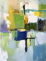 Dit werk toont een levendige compositie van geometrische vormen in geel, groen, blauw en wit. De zachte overgangen tussen de kleuren en de krachtige penseelstreken creëren een dynamische en moderne esthetiek. De structuur lijkt zowel spontaan als doordacht, ideaal voor creatieve ruimtes of moderne galerieën.