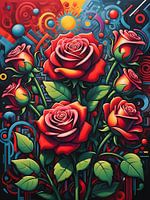 Dit kunstwerk toont een groep rode rozen die in volle bloei staan tegen een levendige en dynamische achtergrond. De bloemen worden weergegeven met gedetailleerde, vloeiende lijnen en levendige kleuren die doen denken aan de stijl van popart en art nouveau. De contrasterende achtergrond met abstracte vormen en heldere kleuren voegt een…