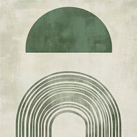 Een harmonieuze compositie ontvouwt zich in zachte groentinten, bestaande uit een elegante halve cirkel en zachte bogen die in lagen zijn gerangschikt. Het gestructureerde achtergrondoppervlak versterkt het minimalistische karakter en creëert een sfeer van rust en evenwicht die de kijker uitnodigt. Een artistieke enscenering van natuur en geometrie.