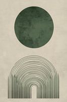 Een harmonieuze compositie van geometrische vormen betovert de kijker. Een elegant gebogen motief van fijne lijnen, dat doet denken aan een zacht golfpatroon, ontvouwt zich boven een weelderige groene cirkel. De zachte kleur van de achtergrond creëert een kalmerende sfeer die de eenvoudige maar krachtige vormen omlijst en uitnodigt tot reflectie.