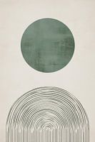 Een zachte tint van de groenachtige cirkel zweeft majestueus boven een elegant boogpatroon dat de zintuigen streelt in harmonieuze lijnen. De geometrische vormen stralen rust en orde uit, terwijl de subtiele texturen een fascinerende diepte geven. Een samenspel van natuurlijke eenvoud en kunstzinnige schikking nodigt uit tot dromen.