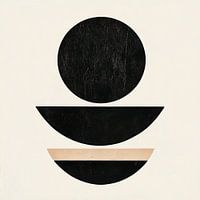 Vormen en kleuren komen samen in een harmonieuze opstelling: een dominante zwarte cirkel zweeft boven twee halvemaanvormige bogen die zachtjes met elkaar contrasteren. De subtiele lichtlijn doorbreekt de duisternis en geeft de algehele compositie een eigentijdse elegantie. Deze minimalistische elementen nodigen uit tot nadenken en dromen.