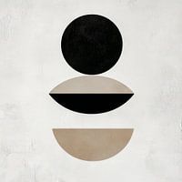 Drie harmonieuze vormen dansen op een zachte achtergrond: een zwarte cirkel zweeft bovenaan, gevolgd door een halve maan en een zachte aardetint. Deze minimalistische compositie straalt rust en evenwicht uit, terwijl de duidelijke scheiding van licht en donker een gevoel van dualiteit en balans uitstraalt. Een spel van vorm en kleur dat tot nadenken aanzet.