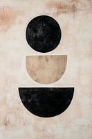 Een harmonieus samenspel van geometrie en kleur ontvouwt zich in drie krachtige vormen: een stralende zwarte cirkel bovenaan, gevolgd door een zachte, beige halve cirkel en tot slot een diepe, schaduwrijke halve cirkel. De aardetinten op de neutrale achtergrond geven de compositie een meditatieve rust en nodigen uit om te blijven hangen.