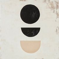 Drie geometrische vormen dansen harmonieus in zachte contrasten. Een zwarte cirkel zweeft bovenaan, gevolgd door een halfgevulde halve cirkel die de dualiteit van licht en schaduw sierlijk omarmt in een zacht beige kleur. De ruwe textuur van de achtergrond versterkt de tactvolle balans tussen de elementen en nodigt uit tot meditatieve contemplatie.