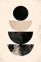 Er ontvouwt zich een harmonieus vormenspel: een lichtgevende cirkel troont boven zachte halve bollen in verschillende tinten. Donkere texturen contrasteren met aardetinten, terwijl de opstelling rust en evenwicht uitstraalt. Elk element spreekt van een doorleefde ervaring en de tijdloze schoonheid van geometrische eenvoud. Een visuele meditatie in minimalistische elegantie.