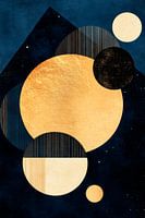 Met gloeiende gouden cirkels die elegant boven een diepblauwe achtergrond zweven, straalt dit kunstwerk tijdloze harmonie uit. De combinatie van geometrische vormen en verschillende texturen geeft het een modern tintje. Het is perfect voor een stijlvolle woonkamer en creëert een sfeer van rust en inspiratie.
