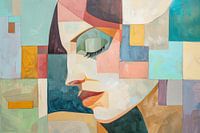 Deze betoverende geometrische afbeelding van een vrouw combineert zachte pasteltinten met strakke lijnen om een harmonieuze en rustgevende compositie te creëren. De zachte gele, roze en blauwe tinten geven de afbeelding een warme en uitnodigende sfeer, terwijl de geometrische vormen diepte en complexiteit toevoegen. Ideaal voor moderne…