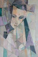 Deze betoverende geometrische afbeelding van een vrouw combineert zachte pasteltinten met strakke lijnen om een harmonieuze en rustgevende compositie te creëren. De zachte gele, roze en blauwe tinten geven de afbeelding een warme en uitnodigende sfeer, terwijl de geometrische vormen diepte en complexiteit toevoegen. Ideaal voor moderne woonruimtes en kunstliefhebbers die op zoek zijn naar een stijlvolle en contemplatieve wanddecoratie. Dit kunstwerk brengt een verfijnde elegantie en tijdloze schoonheid in elk interieur.