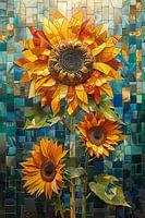 Digitale weergave van zonnebloemen met geometrische patronen en heldere kleurverlopen.