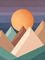 Dit is een gestileerd abstract landschap met geometrische voorstellingen van bergen onder een grote, warme zon. De bergen zijn afgebeeld met scherpe, hoekige vormen in een gedempt palet van bruintinten, groentinten en crèmekleuren, waardoor een gelaagd effect ontstaat. De lucht is weergegeven in horizontale banden van paars en blauw,…