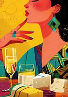Geometry of Taste - Dit vrouwen schilderij kenmerkt zich door een stijlvolle vrouw met opvallend gekleurde geometrische sieraden en gekleurde nagels, die elegant iets aan haar lippen brengt, tegen een achtergrond van levendig gekleurde kazen en glazen met drank.