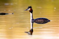 Geoorde fuut (Podiceps cristatus) zwemmend in het ochtendlicht op een meer.