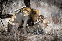 Twee leeuwen bedrijven gepassioneerd een gezamenlijke activiteit
