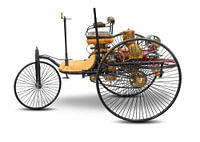 Replica van een oud historisch voertuig genaamd Patent Motor Car geïsoleerd in witte achtergrond met schaduw