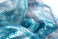Dit werk toont een abstracte close-up van een glanzende, netachtige stof in een rijke blauwe kleur. Het oppervlak wordt doorkruist door een regelmatige rasterstructuur, die wordt benadrukt door vouwen en gerichte belichting. Gecontroleerde scherptediepte creëert cirkelvormige lichtreflecties in de onscherpe delen van het beeld - een fotografisch stijlmiddel dat bekend staat als bokeh. Deze techniek wordt hier niet gebruikt om een onderwerp af te beelden, maar om het terug te brengen tot licht, structuur en kleur.