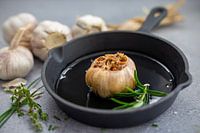 Gepofte knoflook in een gietijzeren pan van Miranda van Hulst