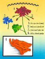 Een kleurrijke litho van een geranium en tuinhandschoenen . Een grafisch, surrealistisch beeld. De grove schetslijnen en de kleuren zijn kenmerkend voor mijn werk, zo ook de kleurenverloop die de achtergrond vult.