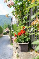 Geraniums in een plantenbak op een muur van natuursteen in het historische pittoreske stadje Dürnstein in het Wachau landschap in Oostenrijk.