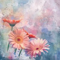 Dit betoverende aquarel kunstwerk toont delicate gerberabloemen in een zacht palet van roze en perziktinten. De bloemen lijken letterlijk over te vloeien in de achtergrond van zachte aquarelverf, wat het kunstwerk een dromerige en romantische sfeer geeft. De bloemige details en speelse kleurspatten maken dit schilderij een perfecte blikvanger voor elke kamer. Dit werk is ideaal voor liefhebbers van florale kunst en aquarel en geeft een frisse en vrolijke uitstraling aan woon- of werkruimtes.