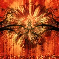 Een Gerbera als zon in een zonsondergang in vele oranje en gele tinten. De kale bomen in silhouet zijn bevolkt met verschillende vogels die genieten van de zon. De bladeren liggen en vallen op de grond onder de bomen.