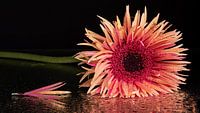 Een stilleven van een roze / fuchsia Gerbera (bloem) liggend op een spiegelend waterig oppervlak (met druppels) met een afgevallen blaadje ernaast.
