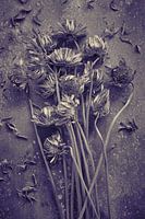 Compositie op zinken ondergrond van gedroogde Gerbera bloemen met vallende herfstblaadjes. Duotone opname van verstrengelde gedroogde bloemen die hun blaadjes verliezen.