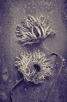 Compositie van 2 grillige en vergane gerbera's op een verweerde zinken ondergrond