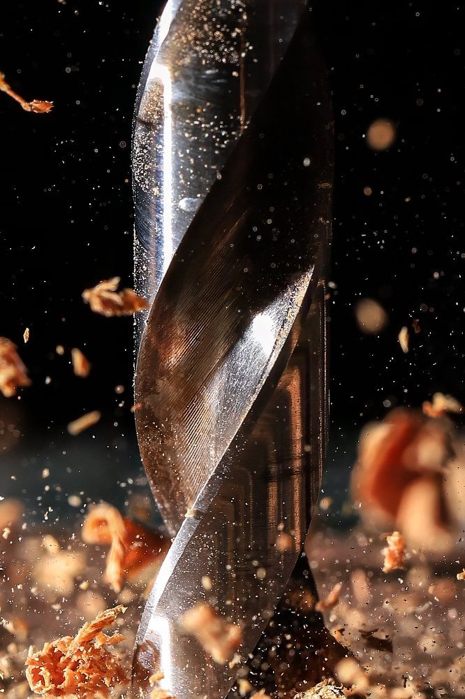 Door de draaiende actie van de boor spatten de houtsplinters alle kanten op.