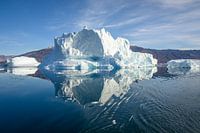 Wanneer je door de Scoresby Sound vaart zie je overal ijsbergen als flatgebouwen zo groot, Bij windstilte krijg je de meest mooie reflecties, hier met de rimpeling veroorzaakt door de Tilvera, een stalen tweemaster waarmee we een tocht door dit prachtige fjord maken.