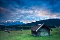 Een houten hut op de weilanden door Geroldsee meer tijdens zonsopgang, Beieren, Duitsland