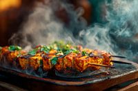 Een heerlijk smakenfestijn ontvouwt zich met dampende kaas die sist op de grill. Sappige stukjes, bedekt met een perfect gearomatiseerde marinade en gegarneerd met vers groen, nodigen uit tot smullen. Dit prikkelende motief past perfect in een uitnodigende keuken of gezellige eethoek en biedt culinaire inspiratie.