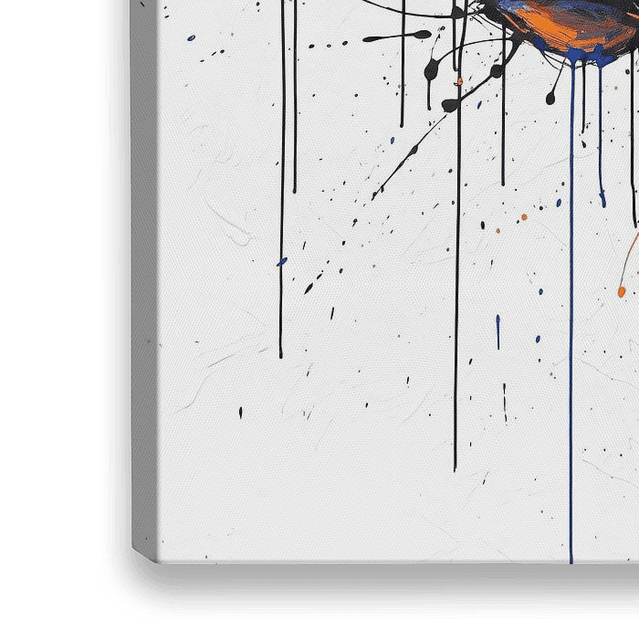 Schilderij van een stierenkop, blauw met oranje hoorns en accenten, op een witte achtergrond met spetters zwarte, blauwe en oranje verf.