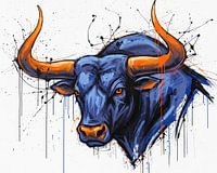 Schilderij van een stierenkop, blauw met oranje hoorns en accenten, op een witte achtergrond met spetters zwarte, blauwe en oranje verf.