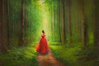 In dit adembenemende werk wordt de schoonheid en kracht van de vrouw gevangen. Haar elegante verschijning, gehuld in een prachtige rode jurk, steekt af tegen de weelderige groene omgeving. Terwijl ze door het bos wandelt, omarmt ze de natuurlijke elementen om haar heen. De zonnestralen spelen verstoppertje door de bladeren van de bomen, en het zachte briesje draagt de belofte van een zonnige toekomst.