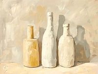 De kunstenaar heeft een subtiele, ingetogen kleurenpalet gebruikt, met tinten variërend van wit tot zachte grijzen en beige, waardoor een rustige en harmonieuze compositie ontstaat. De penseelstreken zijn zichtbaar en dragen bij aan de textuur en de levendigheid van het werk. Er is een spel van licht en schaduw zichtbaar, dat de vormen van de flessen accentueert en diepte creëert binnen de compositie. De flessen lijken zowel solide als etherisch, mede door de manier waarop het licht speelt met hun oppervlakken. Het kunstwerk straalt een serene kalmte uit en nodigt de kijker uit tot contemplatie.