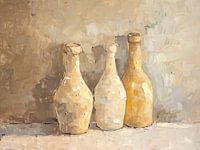 De kleuren variëren van warme aardetinten tot subtiele witte en crème tinten, met accenten van goud en lichtgeel die een gevoel van warmte en diepte creëren. De textuur van het schilderij is opvallend, met dikke, tastbare verfstreken die zowel de flessen als de achtergrond karakter geven.