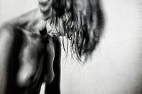 Vrouwelijk gedeeltelijk naakt in zwart-wit.