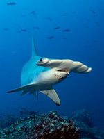 Een hamerhaai, (Sphyrna lewini), zwemt over een rif bij Darwin Eiland, Galapagos Archipel, Ecuador.