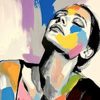 Expressief portret van een persoon met gesloten ogen en het hoofd achterover, alsof het moment van rust of extase wordt ervaren. De stijl combineert elementen van realisme in de gelaatstrekken met abstracte, kleurrijke vlakken die over het gezicht en de kleding van de persoon zijn geschilderd. De contrasterende kleuren - geel, roze,…
