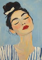 Olieverfschilderij van een portret van een dame met zwart haar in een knot, met een gestreept blauw-wit topje, met dikke penseelstreken, een minimale achtergrond, gesloten ogen, rode lippen en warme tinten, in een vintage stijl.