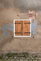 Closed window with wooden shutters on a weathered conctrete wall and old brick street in a grunge old look