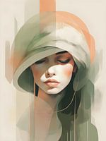 Gesluierd in Zonlicht presenteert een harmonieuze mix van abstract en realisme, waar het gelaat van de vrouw zorgvuldig wordt verhuld door doorschijnende kleurlagen. De zachte pasteltinten en de gedurfde strepen oranje creëren een opvallend contrast, dat een gevoel van hedendaagse elegantie omvat. De compositie wekt een droomachtig beeld op, alsof de figuur tevoorschijn komt uit of wegzinkt in een rijk van pure, verzachtende verbeelding.