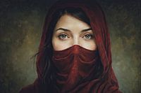 "Veiled Beauty": In dit opvallende portret komt de schoonheid van de gesluierde vrouw tot leven. Haar lichtgroene ogen schitteren door de dieprode hoofddoek, wat zorgt voor een krachtig contrast en een magnetische aantrekkingskracht. Met verfijnde details en zorgvuldige penseelstreken is dit werk een ware blikvanger die elke muur…