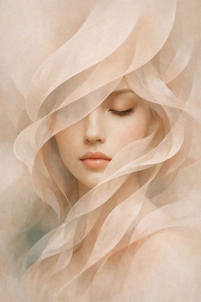 Dit kunstwerk toont een zacht gesluierd vrouwenportret, waarbij vloeiende, doorschijnende lagen het gezicht gedeeltelijk omlijsten en verbergen, waardoor een gevoel van rustig mysterie en emotionele diepgang ontstaat. De zachte beweging van de stofachtige texturen voegt ritme en zachtheid toe, terwijl de gesloten ogen een sfeer van…