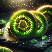 De kleuren zijn rijk en levendig, met een helder groen dat wordt versterkt door de gouden randen van de vrucht. De waterdruppels op het oppervlak vangen en weerkaatsen het licht, waardoor de schijven een levendige, dynamische kwaliteit krijgen. De donkere basis waarop de kiwi's rusten, versterkt hun glans en creëert een dramatisch tafereel dat het oog van de toeschouwer betovert.